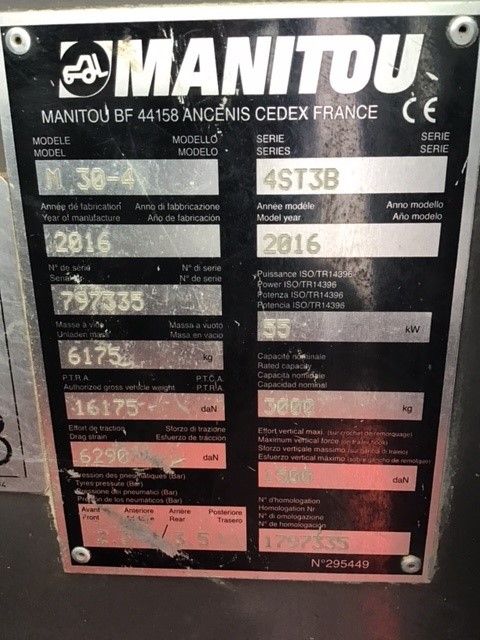 Brands: Manitou Model: M 30-4 Type: Rough terrain forklift truck Capacity: 3000 kg YOM: 2016 |